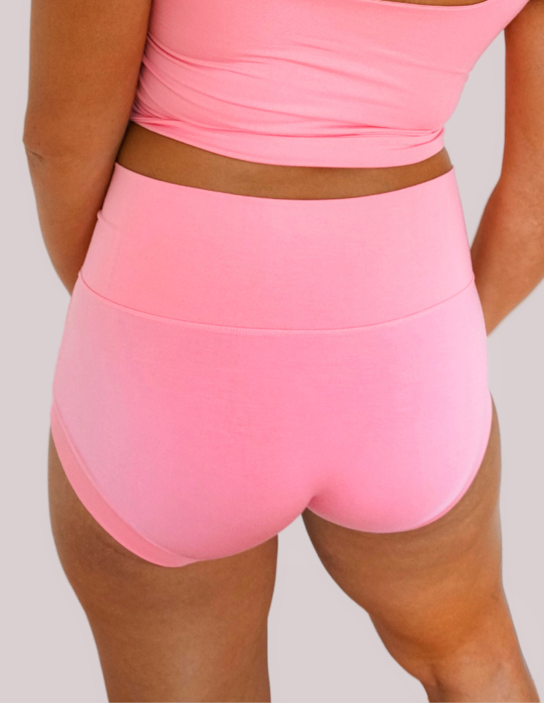 High-waisted Boyshort underwear with comfortable fold-over elastic-free waistband and full coverage seat. Designed to sit comfortably at or above the belly button. Buttery soft, breathable 4-way stretch fabric. Designed to stay put, and not ride up for all day comfort. Waistband smooths you out, and feels like a hug on your tummy. 🤗